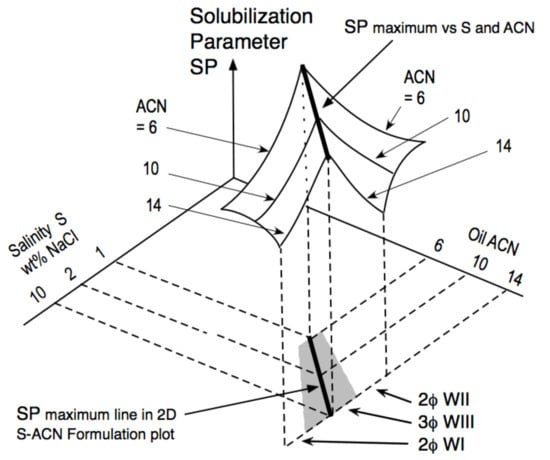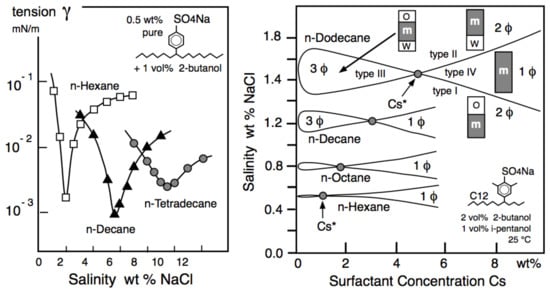 It can be seen that the minimum tension, previously mentioned as the way to determine the optimum formulation V*, is at the center of the three-phase behavior (WIII) zone in Figure 7(1) [26]. Then, the solubilization (as the amount of excess phase incorporated in the swollen micelles or in the bicontinuous structure) passes through a maximum in Figure 7(2), and the partition coefficient of the surfactant between oil and water excesses is close to unity in Figure 7(3), as first mentioned very early for anionic surfactants used in enhanced oil recovery [25,26].