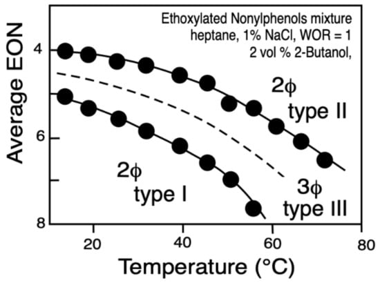 - Anton, R.E.; Castillo, P.; Salager, J.L. Surfactant-Oil-Water systems near the affinity inversion—Part IV: Emulsion Inversion Temperature. J. Dispers. Sci. Technol. 1986, 7, 319–329. [Google Scholar] [CrossRef]