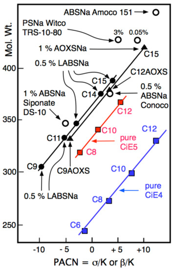 - Ontiveros, J.F.; Pierlot, C.; Catte, M.; Salager, J.L.; Aubry, J.M. Determining the Preferred Alkane Carbon Number (PACN) of nonionic surfactants using the PIT-slope method. Colloids Surfaces A 2018, 536, 30–37. [Google Scholar] [CrossRef]