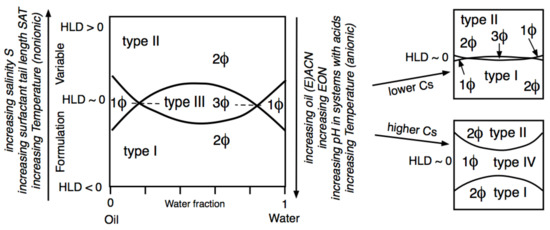 On the Winsor I diagram (here at lower salinity) HLD < 0, i.e., the surfactant has more interactions with the water in which it forms a microemulsion aqueous phase (m in gray in Figure 5) in equilibrium with excess oil, containing practically no surfactant. In the other two-phase Winsor II diagram (here at higher salinity), HLD > 0 and the surfactant is in an oil microemulsion (m in gray) in equilibrium with an excess water.