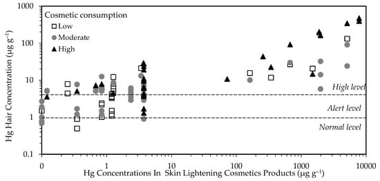 Skin absorption of Hg is controlled by dose, means of application (vehicle), polarity, solubility, pH and frequency of application [,,,]. The grouping of students according to how much (weight) cosmetic cream was used per month indicates that, with prolonged application, the Hg content of the cosmetics is the predominant factor that determines Hg exposure, rather than how much is used. Figure 3 indicates usage (low, moderate or high), plotted as in Figure 2 on a logarithmic scale, indicating that students at all levels of usage are distributed over all levels of HBMC classifications. This indicates no significant correlation between cosmetics consumption and scalp-hair Hg content. Other factors may affect Hg uptake, such as dietary habits, with most students consuming many types of marine fish, which are often contaminated by methylmercury that also accumulates in scalp hair. Endogenous factors may also be involved, such as anatomic variation in skin properties, age, skin health, oxidation and reduction of mercury in the skin []. This study relied on limited hair sample as a biomonitoring sample. For thorough examination, it is important to continue this exposure assessment using other biomonitoring samples such as blood and urine.
