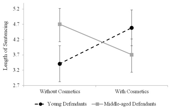 Although no main effect of cosmetics on sentencing was found, we did find a significant interaction between face age and cosmetics for the sentencing decisions of male participants. More specifically, we found that male participants gave young defendants longer sentences when presented with cosmetics and middle-aged defendants shorter sentences when presented with cosmetics. One possibility for only finding a significant interaction in male participants is that female participants may have greater insight into the various motivations behind wearing cosmetics (e.g., looking more professional) and could, therefore, be less prejudiced towards their effect. Indeed, research has found that sex of participant significantly influences the effect of cosmetics on judgements [14,25]. For instance, McKeachie [26] found that male participants rated women as more frivolous and less conscientious when wearing cosmetics while Cash et al. [14] found that the ratings of female participants were not affected by the presence or absence of cosmetics.