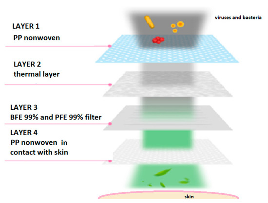 On the other hand, the reusable surgical face masks have a reduced filtration power and protection efficiency, due to their frequent washing cycles. In addition, the repeated laundering causes a further waste of energy, generating also more wastewater in the environment. As previously reported non-woven masks, made by two/three layers of tissues and principally used in hospitals, are manufactured worldwide by PP, as the most used polymer (Figure 1). Different are the designs that can be followed. In the reported example of Figure 1, composed of four-layered tissues, the first non-woven layer avoids the ingress of dust-air, the fourth layer in contact with skin has a protective function, while the second and third core layers, have a bacterial filtration capacity of 99% and a particulate filtration effectiveness of 99%, usually obtained by melt blown non-woven fabrics.