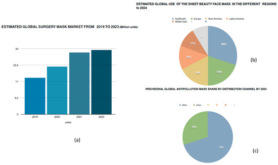 Figure 2. (a) The incremental growth of surgical masks [20]. (b) Global surgical masks market share by region in 2018. (c) Disposable surgery face masks by application: industrial and personal (by courtesy of GranViewResearch [18]).