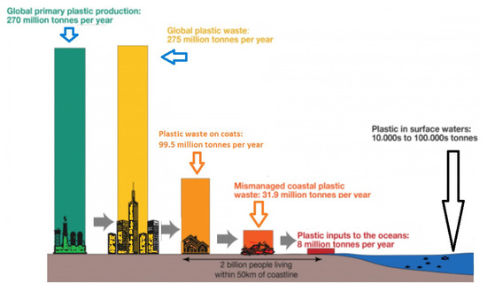 Figure 4. The pathway by which plastic enters the world’s oceans: estimates of global plastics entering the oceans from land-based sources in 2010 (based on data from Jambeck et al. [30]).