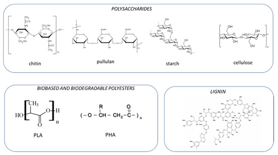 For producing SFMs or BFMs several biobased materials can be considered. The class of polysaccharides (Figure 6) consists of very hydrophilic polymers, able to retain water when at the wet state, with the possibility to transfer it to the skin, when in contact with its surface. Hence their use in beauty masks could be useful. Some of these polysaccharides, in fact, may be soluble in water like pullulan or insoluble but easily suspendible, such as starch, cellulose or chitin nanofibrils, obtained as a polymer covered by positive charges. However, all these polymers’ results are promising for their possibility to be electrospun in water [43,44,45,46]. On the other hand, they are not highly thermally resistant, so their processing by conventional methodologies can be quite difficult.