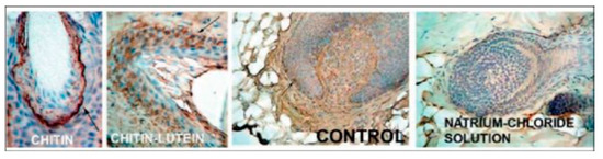Among the biobased, biodegradable and coating materials, chitin nanofibrils can be used as a functional additive for tissues, such as for example PLA films [75] or cellulosic substrates [76]. It is also interesting to underline that chitin nanofibrils have been shown to increase not only the tensile strength and Young modulus of various composites made, for example by chitosan [56,76] or polylactic acid (PLA) [75,77], but also to stimulate the skin differentiation and maturation of CD34-posive cells of rats with the characteristics of stem cells, for example, at the level of the hair bulb (Figure 7) [78]. As it appears from the reported immuno-histochemical study, the CD34-positive cells appear to be more expressed in skin treated by CN and CN-Lutein compared with the non-treated control (Figure 7).