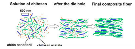 What is the reason of the reinforcing activity of chitin nanofibrils when used as a filler to realize nanocomposites with chitosan [76] or polylactic acid [56,71,73]. According to the Yudin group research studies [76], it has been supposed that CN “contributes to the orientation of the chitosan macromolecule that leads to an increased strength and elastic Young module of the composite fibers” as reported on Figure 8, contributing also to the degradability and sustainability of the nanocomposite processing [67,68,76,77]. The introduction of CN into the chitosan matrix could contribute to form a more bioresorbable composite, increasing its biocompatibility, bioactivity, hemocompatibility and effectiveness at the skin level [76,79,80,81].