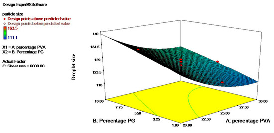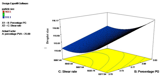 Three-dimensional surface graphs showing the effect of percentage PG and shear rate on droplet size; percentage PVA was kept constant.