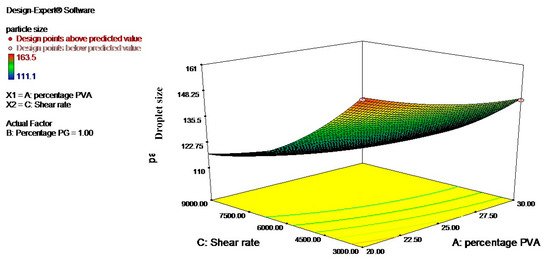 Three-dimensional surface graphs showing the effect of percentage PVA and shear rate on droplet size; percentage PG was kept constant.