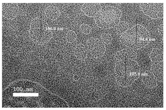 Figure 4 represents the TEM image of the KMO formulation in the nanoemulsion size. The nanoemulsion was distributed almost uniformly and homogenously in the system. The droplet size analyzed from the TEM corresponded with the size obtained from the Zetasizer analysis. However, there were some large droplet sizes, as can be seen in Figure 4, which may be due to the Ostwald ripening occurrence, causing the enlargement of the droplet size.