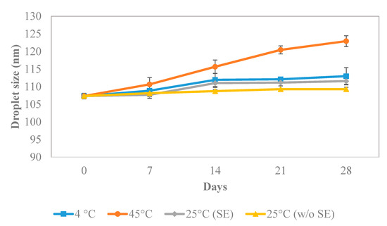 Figure 5 shows that the droplet size of the emulsion slightly increased from 107.35 to 122.95 nm at 45 °C, however, the formulation at all conditions was able to maintain its nanosize range between 20–200 nm. This shows the effectiveness of the xanthan gum in the nanoemulsion system to retain smaller droplet sizes and stability [22].