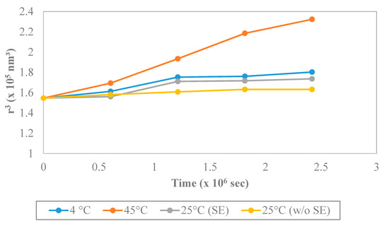 Ostwald ripening is the product of enlargement of droplet size due to the diffusion of the oil phase through the aqueous phase and can be investigated by plotting r3 vs. storage time (seconds). The KMO formulation under four different temperatures during 28 days of storage was affected by Ostwald ripening (Figure 7). A low Ostwald ripening effect can be seen during storage at 25 °C as the droplet size increased slowly, while higher Ostwald ripening effect was identified at 45 °C as the droplet size became larger, indicating the low stability of the nanoemulsion at a higher temperature.