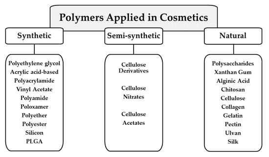 Polymers are an important class of raw materials of cosmetic formulations, being essential in the production of high-performance products. They are classified as synthetic, semi-synthetic, or natural (Figure 1) macromolecules composed of many repeating units (monomers) usually arranged in the form of a chain. In cosmetics formulations, its structural diversity is used to promote a variety of functions as rheology modifiers, thickeners, foam stabilizers and destabilizers, emulsifiers, fixatives, conditioning, and film formers [,,].