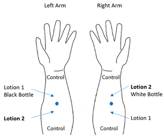 The individuals were provided with two lotion bottles marked simply as Lotion 1 (in a black bottle) and Lotion 2 (in a white bottle). It was important for the individuals not to mix up the bottles or treatments which would take place at home during the 12 days of the study. For this reason, the bottles were differentiated by color and the participants were provided with a copy of Figure 1 to use as a guide. The participants were asked to apply approximately a dime sized quantity of product to each treatment site and to rub the product in well using separate fingers in an area of approximately 4 × 4 cm taking care not to place product into the areas of the control measurements or to cross over the indelible ink mark. The ink mark, which was maintained throughout the study, allowed constant control of testing site measurement locations.