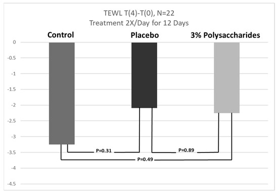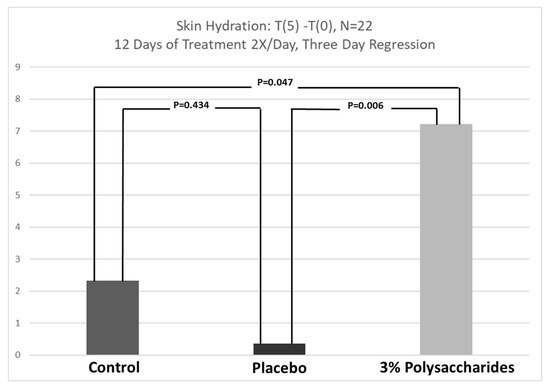 In earlier work examining the moisturizing benefits of the polysaccharides, it was noted that in a skin hydration study that included a single application of product containing 3% of the polysaccharides, skin moisturization was improved verses placebo-treated sites over a 48-h time frame [8,9]. It was hypothesized that the reason for this benefit was that the blend of polysaccharides was a high molecular weight mixture of strong water-binding polysaccharides that were not naturally recognized by the skin and so subsequently would not be quickly degraded and removed by normal skin biological responses. It was noted that to attain longer term hydration, ingredients applied to the skin would likely need to be higher molecular polymers or polysaccharides that are not degraded by the skin’s normal biological processes as smaller molecules such as pyrrolidone carboxylic acid (PCA), lactic acid, urea or glycerin would be. However, the original study, while compelling, was not done in the typical fashion that extended skin moisturizing studies are run. Typically, to examine extended skin moisturization, a regression study is required. During this study, an opportunity to examine skin moisturization via a regression study presented itself. Results of this study are shown in Figure 5.