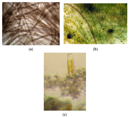 Cyanobacteria species composition. (a) Oscillatoria sp. from a floating mat; (b) green film dominated by Spirulina cf. labyrinthiformis and Leptolyngbya sp. a brown filament of Oscillatoria sp. is also visible; (c) Diatoms (Pinnularia sp.) growing on the surface of the mud in maturation.