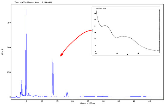 There were peaks very similar to those of the mature mud (six months) in the area with a Rt between 2 and 6 min. The spectra show the presence of substances that absorb at 400–450 nm and 560–660 nm, which can be attributed to carotenoids, biliproteins, and chlorophyll. The chromatogram also gave peaks of photoprotective substances that absorb at 300 nm. This is in agreement with the ability of cyanobacteria to process radical scavenging and UV absorbing compounds [37,38,39,40,41]. These data were confirmed by spectrophotometry.