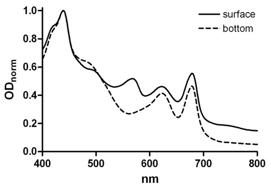 At Saturnia spa, the environmental conditions are quite stable (constant temperature, pH and water composition) except for light intensity and quality. The species that form the photosynthetic community appear not to have significantly changed in the last four decades, as Bazzichelli et al. [33] reported a composition similar to that described in this work. The constancy of the environment is reflected in the composition of the population. The bottom of the pond is patchily covered with a brownish mat mainly composed of a phycoerythrin-containing Oscillatoria sp. (Figure 1a) and a green film dominated by Spirulina cf. labyrinthiformis and a Leptolyngbya sp. (Figure 1b). In addition to cyanobacteria the mat includes photosynthetic bacteria (mainly green sulphur bacteria) and non-photosynthetic sulphur bacteria such as Beggiatoa. The species forming the mats are the same in different periods of the year, but their relative abundance can change. In spring, early summer and autumn, the floating mat was dominated (42–92%) by a dark brown Oscillatoria, while the bottom biofilm was dominated by Spirulina cf. labyrinthiformis (64–90%). In August S. cf. labyrinthiformis was the main organism in the floating mat which, however, showed evident signs of degradation and the previous presence of phycoerythrin-containing organisms, probably the dark brown Oscillatoria. At the same time, the bottom of the pool was amply covered by a thick mat of dark brown Oscillatoria. During the central hours of the day the Oscillatoria sp. mat starts to float, probably because gas bubbles remaining trapped inside of it. The gases, besides oxygen, are very likely those associated with the spring water, since inside the Oscillatoria sp. filaments sulphur granules are often visible, indicating probable anoxygenic photosynthesis.
