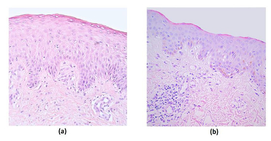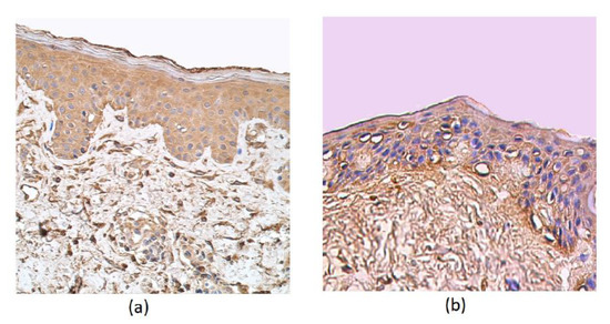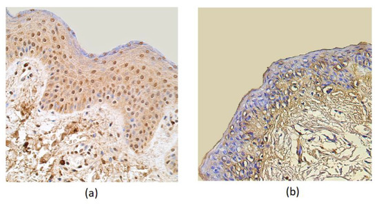 Moderate to numerous cathelicidin-positive epithelial cells were detected in the patient samples. In the epithelium and connective tissue of the control group and in the subepithelium of affected tissue, a few positive structures of cathelicidin were detected (Table 1, Figure 4a,b).