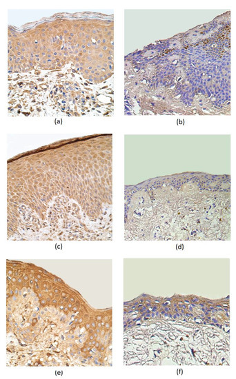 IL–1α was present in a moderate number of epithelial cells and in a few subepithelial connective tissue cells of rosacea-affected samples. The IL-1α distribution both in the epithelium and subepithelium showed only occasional positive cells in the control group (Table 1, Figure 2a,b). In rosacea-affected tissue, the number of IL-10-containing epitheliocytes greatly exceed the number of immunoreactive cells in the epithelium of the control group (a few positive structures). Positive cells of IL-10 were more observed in the connective tissue of the affected group (a few to moderate) than in the connective tissue of the control group (few) (Table 1, Figure 2c,d). A moderate number of HBD-2 immunoreactive positive structures appeared in the epithelium and subepithelium of the rosacea-affected group. A few to a moderate number of HBD-2-containing structures were observed in the epithelium of the control group, while no positive structures were detected in the connective tissues (Table 1, Figure 2e,f).