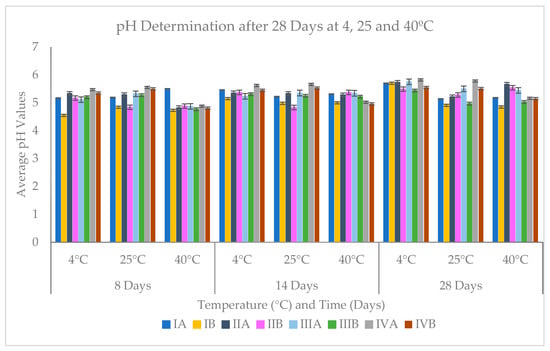 Average cumulative pH values/deviation after 28 days for each product stored at 4 °C, 25 °C and 40 °C.