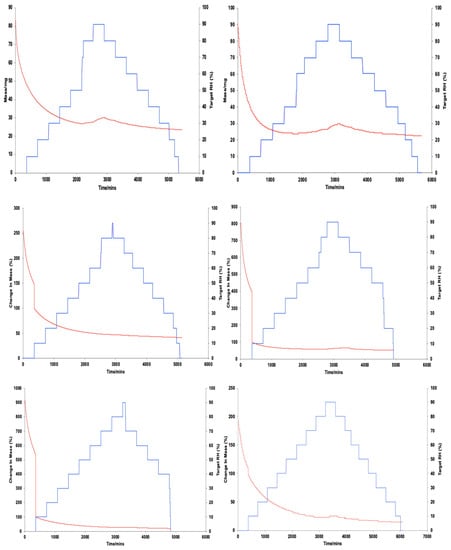 Target relative humidity (decreasing steps) and % change in sample mass through moisture content loss (desorption).