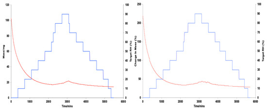 Target relative humidity (increasing steps) and % change in sample mass through moisture content uptake (sorption).