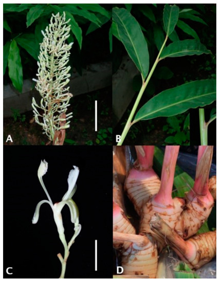 Alpinia galanga (L.) Willd. (A) Inflorescence. (B) Leafy shoot. (C) Close-up of a single flower. (D) Rhizomes. Scale bars: 5 cm for (A). 1 cm for (C). Pictures by Nobuyuki Tanaka.