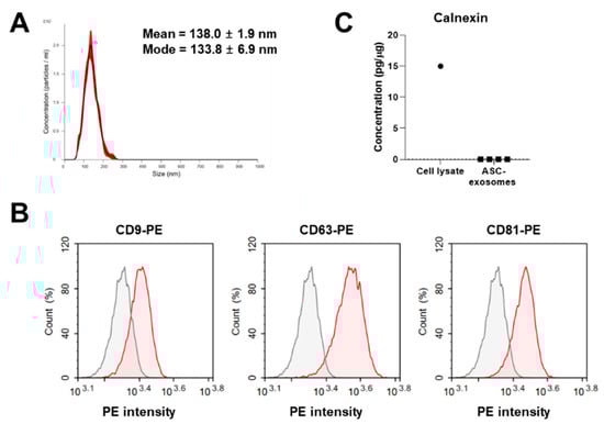 Characteristics of human adipose tissue-derived mesenchymal stem/stromal cells (ASC-exosomes). (A) A representative Nanoparticle Tracking Analysis (NTA) histogram of ASC-exosomes. (B) Bead-based flow cytometric analysis of ASC-exosomes with antibodies for indicated proteins. ASC-exosomes were captured by Dynabeads coated with antibodies for exosome surface markers including cluster of differentiation 9 (CD9), CD63, or CD81. Then, the phycoerythrin (PE)-conjugated antibodies were reacted with captured ASC-exosomes as indicated. The mouse immunoglobulin G1 (IgG1)-PE was used as an isotype negative control. Gray peaks, PE fluorescence count from isotype control antibody; red peaks, PE fluorescence count from antibodies for indicated proteins (CD9, CD63, and CD81); X-axis, signal intensity of PE. (C) Concentration of calnexin measured by ELISA. n = 4 for ASC-exosomes and n = 1 for cell lysates performed in duplicate.