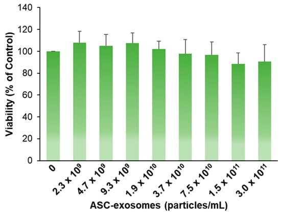 The effect of ASC-exosomes on the production of melanin was assessed in B16F10 mouse melanoma cells in vitro. First, the effect of ASC-exosomes on the viability of B16F10 cells was analyzed. B16F10 melanoma cells were treated with ASC-exosomes for 72 h, and the viability of the cells was assessed. As shown in Figure 2, no distinct reduction in cell viability by ASC-exosomes was observed up to a concentration of 3.0 × 1011 particles/mL.