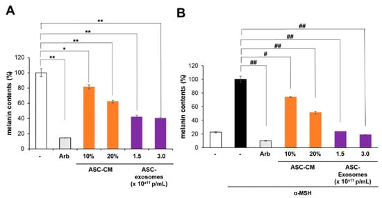 The antipigmentation effect of ASC-exosomes in the absence and presence of α-melanocyte-stimulating hormone (α-MSH). The melanin levels in B16F10 melanoma cells were measured after treatment with ASC-exosomes in the (A) absence or (B) presence of α-MSH for 48 h. Representative data are presented as the mean ± SD from multiple experiments performed in triplicate. (A) * p < 0.05 and ** p < 0.01 vs. the negative control group were considered statistically significant. (B) # p < 0.05 and ## p < 0.01 vs. the α-MSH control group were considered statistically significant. Arb: arbutin.