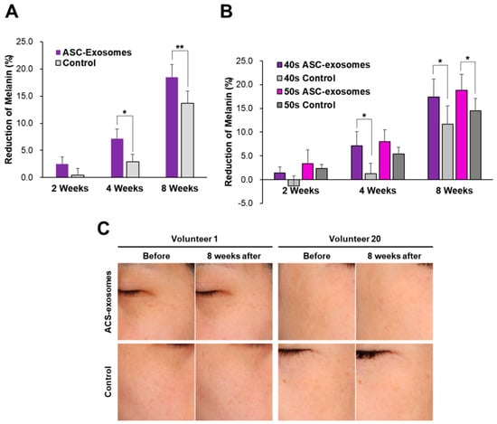 Clinical evaluation of the skin brightening effect of ASC-exosomes. Melanin levels were measured using a Mexameter on the faces of 21 female volunteers before and 2, 4, and 8 weeks after treatment with a placebo (without ASC-exosomes) or test (with ASC-exosome) formulation twice daily for 8 weeks. (A) Reduction of melanin over time. (B) Reduction of melanin in different age groups. n = 11 for 40s and n = 8 for 50s. * p < 0.05 and ** p < 0.01 vs. placebo-treated area was considered statistically significant. (C) Representative images of two volunteers.
