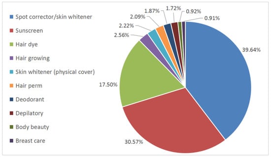 General distribution of existing special cosmetics in China. It is an approximate proportion generated from the total numbers of valid products in each category.