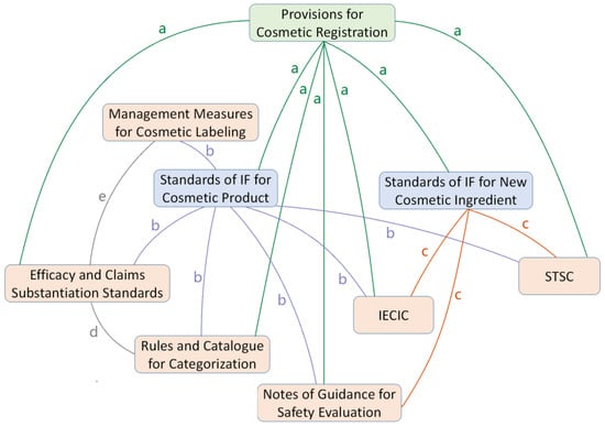 Major regulations involved in the technical evaluation of cosmetics. In this figure, regulations directly or strongly related to the technical evaluation work of cosmetic products and new ingredients are included, and the curves indicate the relevance of the regulations: (a) these regulations are based on and under the system of the “Provisions for Cosmetic Registration”; (b) the “Standards of IF for Cosmetic Product” is the core regulation in product submission, and technical regulations are cited in the standards as basis or reference; (c) the “Standards of IF for New Cosmetic Ingredient” is the core regulation in new ingredient submission, and technical regulations are cited in the standards as basis or reference. In addition, it contributes to the ingredient management system together with IECIC and STSC; (d) the “Efficacy and Claims Substantiation Standards” and “Rules and Catalog for Categorization” share a unified logic and principle of efficacy category; (e) labeling information of cosmetic products should be based on efficacy and claim substantiation.