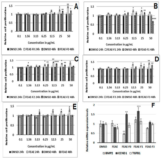 Relative cell proliferation activity after 24 h and 48 h treatment with FEAE-F0 (A), FEAE-F1 (B), FEAE-F2 (C), FEAE-F3 (D), FEAE (E) and the extracts mRNA regulation of bone morphogenetic protein 2 (BMP2), cyclin-D1 (CCND1) and transforming growth factor beta (TGFB1) ± S.E. (F). Significance is determined by ‡ p < 0.05, ‡‡ p < 0.01, ‡‡‡ p < 0.001 and ‡‡‡‡ p < 0.0001.