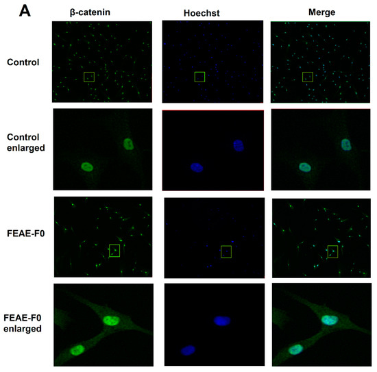 (A) β-catenin expression in dermal papilla cells after 72 h of treatment in control medium or supplemented in 50 μg·mL−1 FEAE-F0 and nuclei counterstained with Hoechst followed by immunofluorescence. Objective ×10 and enlarged images ×4. Green rectangles correspond to zoomed area. (B) Relative nuclear β-catenin expression levels in immunocytochemistry (ICC) after 72 h growth in medium with 0.5% DMSO or FEAE-F0 at a concentration of 50 μg·mL−1. Significance is determined by **** p < 0.0001.