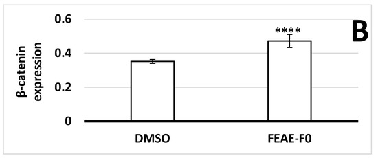 Reported studies have shown crosstalk between Wnt and TGFβ signaling [35,36]. Inhibitors of the Wnt pathway show a subsequent increase in TGFβ signaling in non-balding cells, as well as an increased TGFβ1 expression [36]. Likewise, BMP signaling prohibits activation of the Wnt pathway during the telogen phase. As the signaling environment of the cells changes, BMP levels lower to allow an upregulation of Wnt signaling and thus entry into anagen phase [24]. FEAE-F0 stood out as the most active fraction by displaying a similar regulation. Indeed, it not only increased activation of the Wnt pathway, as seen by the upregulation of CCND1, but it also downregulated BMP2. By lowering BMP signaling, FEAE-F0 facilitates transitioning to the follicle growth (anagen) phase. This can be observed by an increase in Wnt signaling [24]. CCND1 is a downstream target of the Wnt pathway and a rise in its expression levels suggested a stimulated Wnt state that we aimed to confirm by following β-catenin expression in the presence of FEAE-F0.