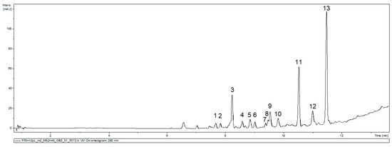 An identification of the main compounds present in FEAE-F0 was attempted by UHPLC-MS/MS analysis. The MS/MS data analyzed was that of 20 eV and 40 eV collision energy in positive and negative ionization mode. Thirteen main peaks were identified on the UV chromatogram in Figure 4. The compilation and tentative identification of the peaks by MS2 correspondence were reported in Table 2.