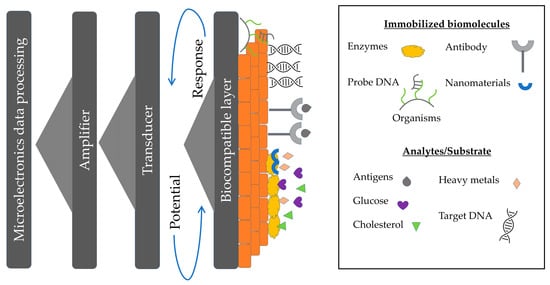 The schematic diagram of a biosensor incorporates a living organism or product derived from a living system as the recognition element or a bioreceptor and a transducer to convert a biological reaction into a measurable signal or indication.