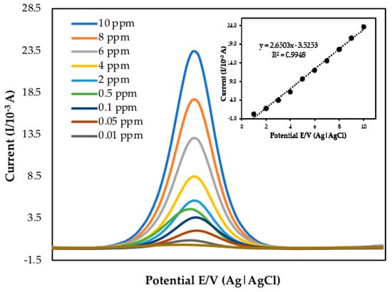 Sensitivity is the capability to respond to changes in the concentration of analyte efficiently and measurably. Due to the high relative sensitivity compared to CV analysis, the DPV technique was used to measure mercury. The detection limit is the smallest quantity that differs significantly from the blank. It is observable when the signal is more significant than three times the noise but cannot be quantified accurately. The DPV of PANI/MWCNTS/AuNPs/ITO electrode in the presence of different standard mercury concentrations are shown in Figure 2. As the concentration of mercury increased, the anodic current increased. The inset shows the calibration curve of different mercury concentrations in 50 mM Tris-HCl (pH 7.0) with 1 mM MB as a redox indicator with a potential range of +0.4 to +2.0 V using 0.10 Vs−1 scan rate according to Bohari et al. [42]. With increasing concentration of mercury, the peak currents increased linearly. The increment of mercury concentration attaches on the electrode surface, the peak potential shifted positively, and the separation of peak potential increased. Additionally, both anodic and cathodic peak currents grew.