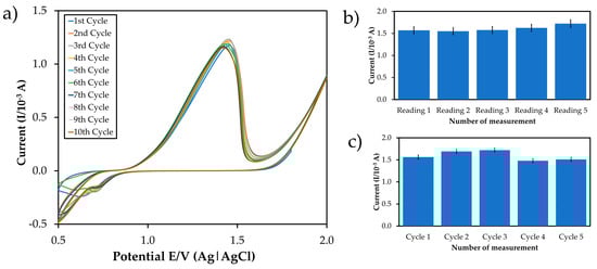 Multiple cycling, reproducibility, and repeatability studies were conducted to observe the occurrence of redox reaction and test the developed sensor (pH 7.0, Tris-HCl buffer, 50 mM Tris-HCl). The multiple cycling or electrode consistency is when the same quantity of one sample is repeated over the same electrode several times. It is a measure of electrode response variations. In this study, the multiple cycling studies were performed by setting 10 cycle numbers, and the potentiostat automatically generated the data with the time frame. Bohari et al. [42] reported that repeatability described the minimum, and reproducibility described the maximum variability in results. Reproducibility is interlaboratory accuracy when aliquots of the same sample are tested with the same modifications onto different electrodes. It was evaluated with the same mercury concentration on five consecutive days with five modified electrodes independently prepared in the same experimental conditions (pH 7.0, Tris-HCl, 1 mM MB). Repeatability is defined as the degree of single-coated sensor used continuously under similar operating conditions for a series of measurements that can produce the same result using the same substrate concentration [49,50]. Five successive DPV scans on the modified electrode’s surface in 50 mM Tris-HCl (pH 7.0, 1 mM MB) were reported to investigate the modified electrode’s repeatability. These results indicated that the modified ITO electrode possesses high precision since it has good reproducibility and acceptable multiple cycling and repeatability. Reproducibility studies were conducted on the same condition except on different days, and for 21 days, the findings were showed to be less than 10% RSD [6]. Based on the results obtained (Figure 3), the peaks were close to each other and showed that the modified ITO provided high sensitivity and accuracy for mercury determination due to the constant of the current responses supported by Kulikova et al. [48] and Kuzin et al. [51]. These results indicated good reproducibility of the modified electrode.