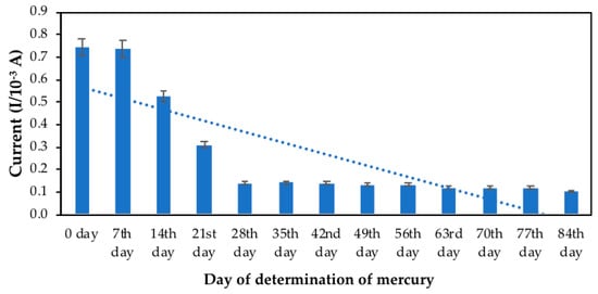 The sensor’s storage stability was analysed by periodically checking their current responses up to twelve (12) weeks, or 84th day. Figure 4 summarises the storage stability of the modified results of PANI/MWCNTs/AuNPs/ITO electrodes. The possible peak current response was slightly higher when the change was held for up to 14th day. After day 14, peak mercury currents decreased compared with the initially produced electrode to 4.1%. The results showed that the electrode response to mercury after 0, 7th, and 14th day was respectively 99, 98, and 95% of its original value. The slight decrease in the current response was indicated the long-term and high stability of the developed sensor for the determination of mercury. The PANI/MWCNTs/AuNPs/ITO electrode tends to have sufficient stability. A gradual decrease of reduction peaks was observed, indicating the chemical reaction’s behaviour at the interphase of electrode dropped. No further interaction at the interphase of the modified electrode occurred efficiently with the analyte in the electrochemical cell. The free gold did not embed in MWCNTs to retain its movement, making it floating freely or suspended in electrochemical electrolyte might be contributed.