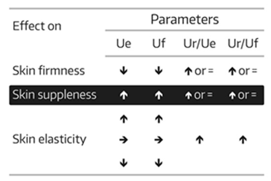 Definitions of skin firmness, skin suppleness and skin elasticity applied in the study. Ue = immediate distensibility, Uf = total skin distensibility, Ur = immediate recovery, Ur/Ue = net elasticity, Ur/Uf = ratio of elastic recovery to distensibility.