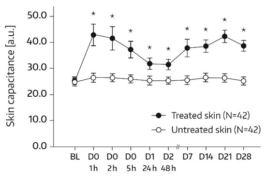 Results from skin capacitance measurements in untreated skin and skin undergoing a single application of Emollient 3 (first 48 h) followed by once-daily application for 26 days. The values were assessed by corneometry and are presented as mean ± SD. BL = Baseline skin capacitance value before first product application; D = day; h = hour. * p < 0.001 if compared to untreated control, paired t-test.