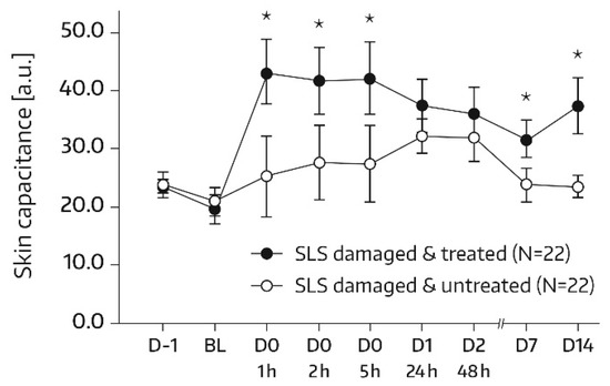 Results from skin capacitance measurements in untreated SLS-damaged skin and SLS-damaged skin undergoing a single application of Emollient 1 (first 48 h) followed by once-daily application for 12 days. The values were assessed by corneometry and are presented as mean ± SD. SLS challenge started on day -1 and ceased 24 h later (30 min before BL assessment). BL = Baseline skin capacitance value before first product application; D = day; h = hour; SLS = sodium lauryl sulfate.* p < 0.001 if compared to untreated control, paired t-test.