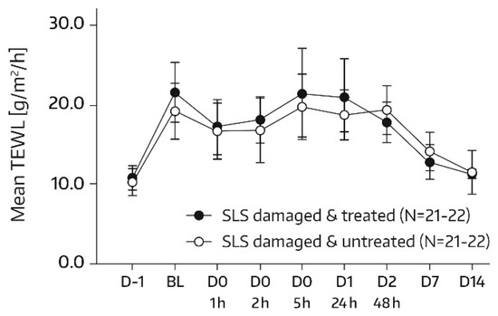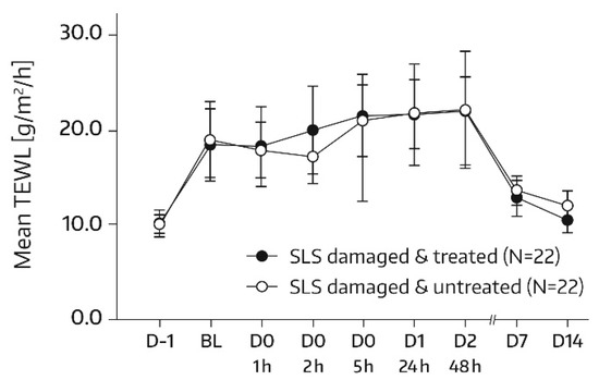 Results from TEWL measurements in untreated SLS-damaged skin and SLS-damaged skin undergoing a single application of Emollient 2 (first 48 h) followed by once-daily application for 12 days. The values are presented as mean ± SD. SLS challenge started on day -1 and ceased 24 h later (30 min before BL assessment). BL = Baseline TEWL value before first product application; D = day; h = hour; SLS = sodium lauryl sulfate.