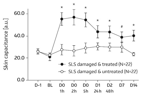 Results from skin capacitance measurements in untreated SLS-damaged skin and SLS-damaged skin undergoing a single application of Emollient 2 (first 48 h) followed by once-daily application for 12 days. The values were assessed by corneometry and are presented as mean ± SD. SLS challenge started on day -1 and ceased 24 h later (30 min before BL assessment). BL = Baseline skin capacitance value before first product application; D = day; h = hour; SLS = sodium lauryl sulfate. * p < 0.001 if compared to untreated control, paired t-test; # p = 0.016 if compared to untreated control, paired t-test.