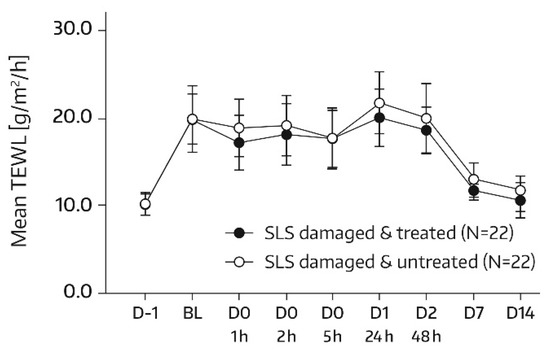 Results from TEWL measurements in untreated SLS-damaged skin and SLS-damaged skin undergoing a single application of Emollient 3 (first 48 h) followed by once-daily application for 12 days. The values are presented as mean ± SD. SLS challenge started on day -1 and ceased 24 h later (30 min before BL assessment). BL = Baseline TEWL value before first product application; D = day; h = hour; SLS = sodium lauryl sulfate.