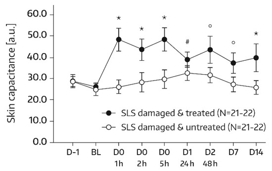 Results from skin capacitance measurements in untreated SLS-damaged skin and SLS-damaged skin undergoing a single application of Emollient 3 (first 48 h) followed by once-daily application for 12 days. The values were assessed by corneometry and are presented as mean ± SD. SLS challenge started on day -1 and ceased 24 h later (30 min before BL assessment). BL = Baseline skin capacitance value before first product application; D = day; h = hour; SLS = sodium lauryl sulfate. * p < 0.001 if compared to untreated control, paired t-test. # p = 0.018 if compared to untreated control, paired t-test. ° p = 0.001 if compared to untreated control, paired t-test.